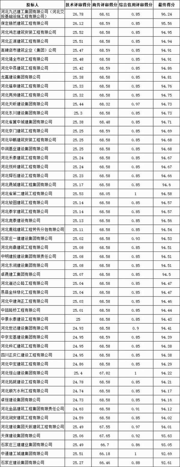 第一中標候選人:河北九達建工集團有限公司(聯(lián)合體成員:河北交投基礎(chǔ)設(shè)施工程有限公司);
