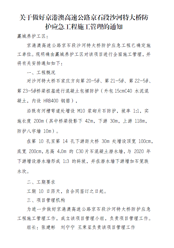 關(guān)于做好京港澳高速公路京石段沙河特大橋防護(hù)應(yīng)急工程施工管理的通知