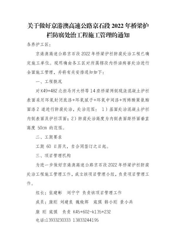 關(guān)于做好京港澳高速公路京石段2022年橋梁護(hù)欄防腐處治工程施工管理的通知