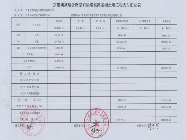 京港澳高速公路京石段增設(shè)路基擋土墻工程施工款