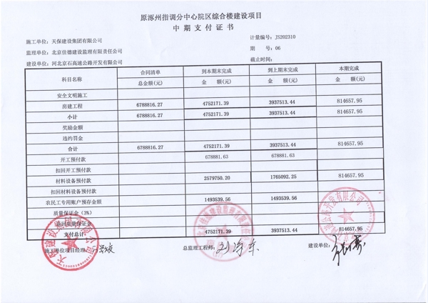 原涿州指調(diào)分中心院區(qū)綜合樓建設(shè)項目第六期中期支付證書