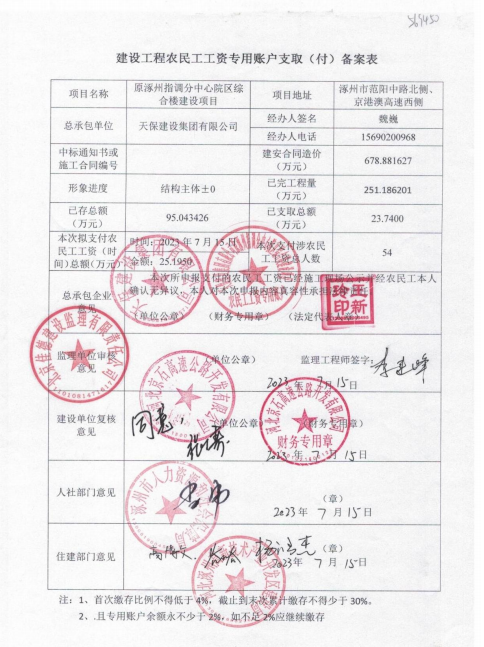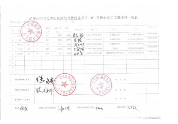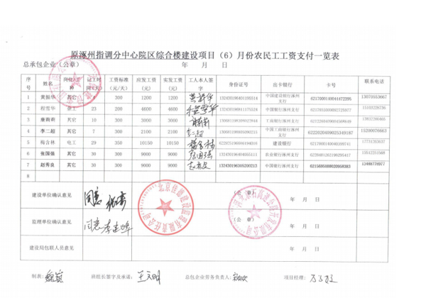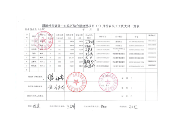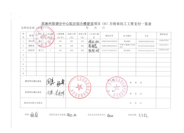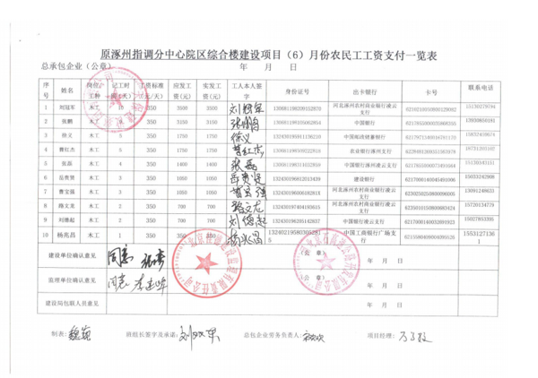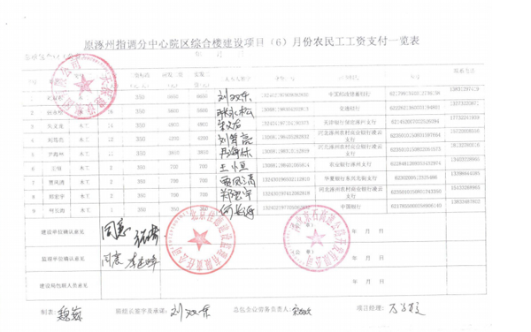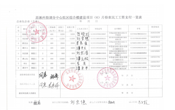 原涿州指調分中心綜合樓建設項目6月份農(nóng)民工工資發(fā)放公示