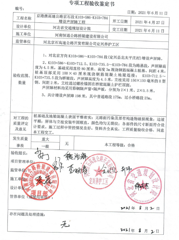 京港澳高速公路京石段K103+586-K103+784段增設(shè)聲屏障工程驗(yàn)收鑒定書