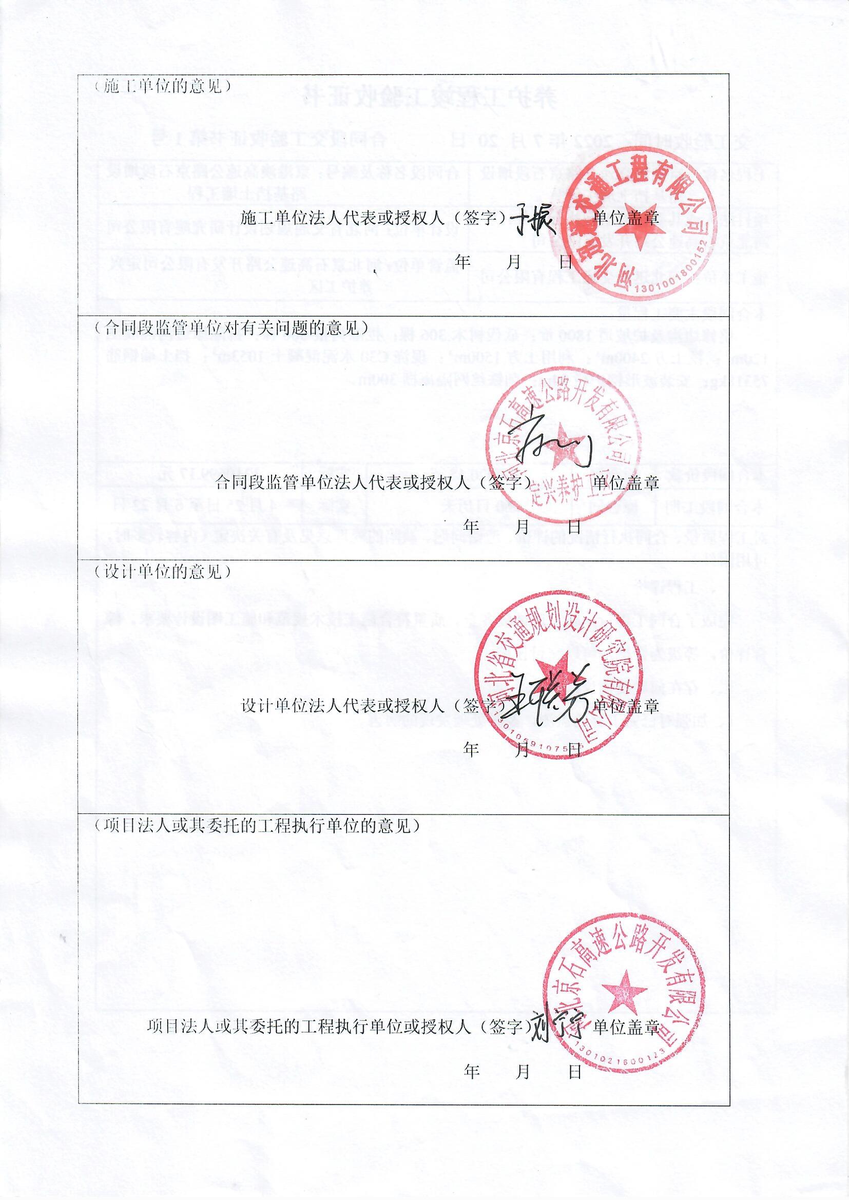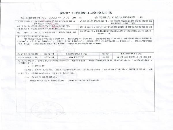 京港澳高速公路京石段增設(shè)路基擋土墻工程驗收證書