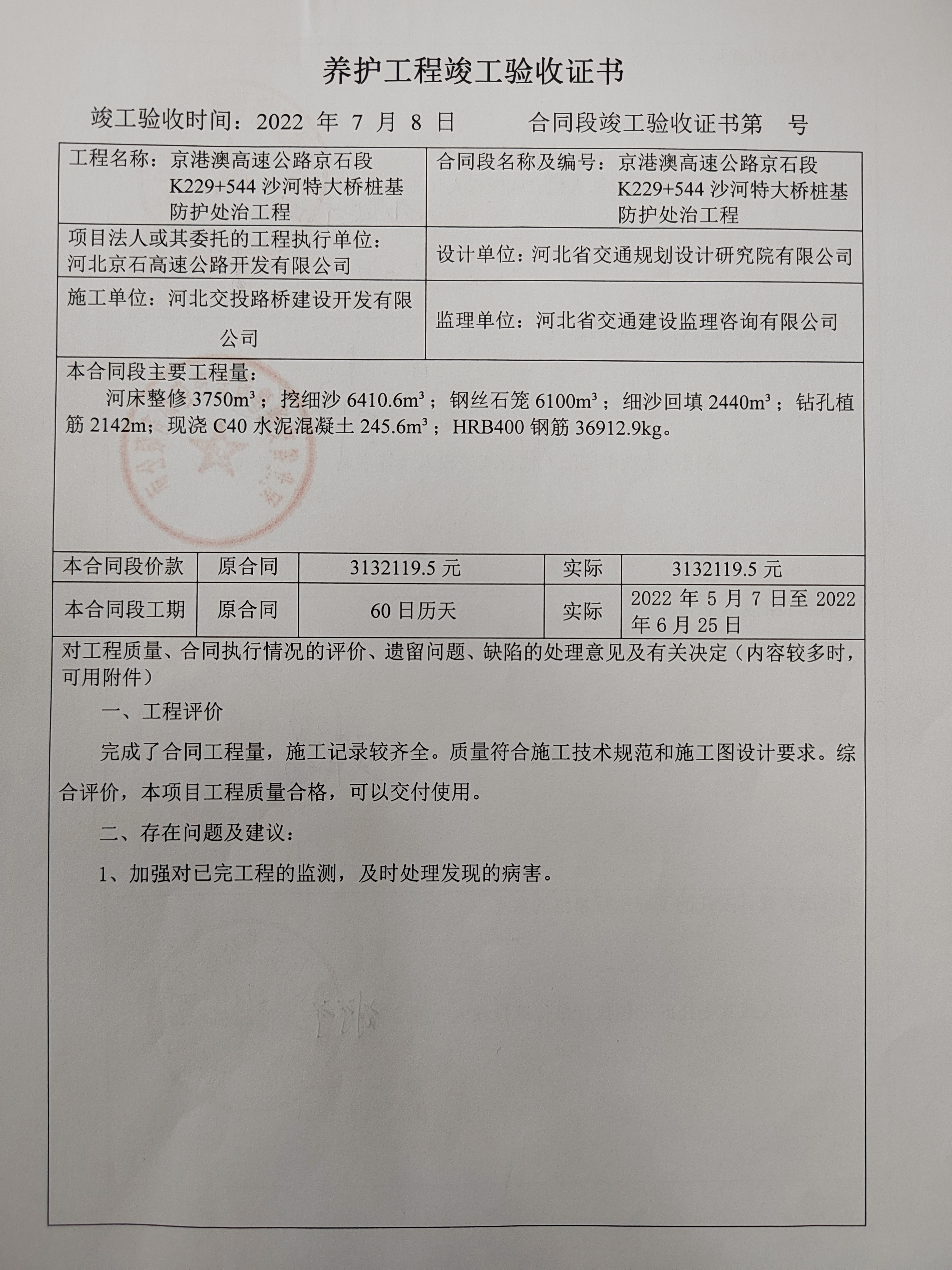京港澳高速公路京石段沙河特大橋樁基防護(hù)處治工程驗(yàn)收證書