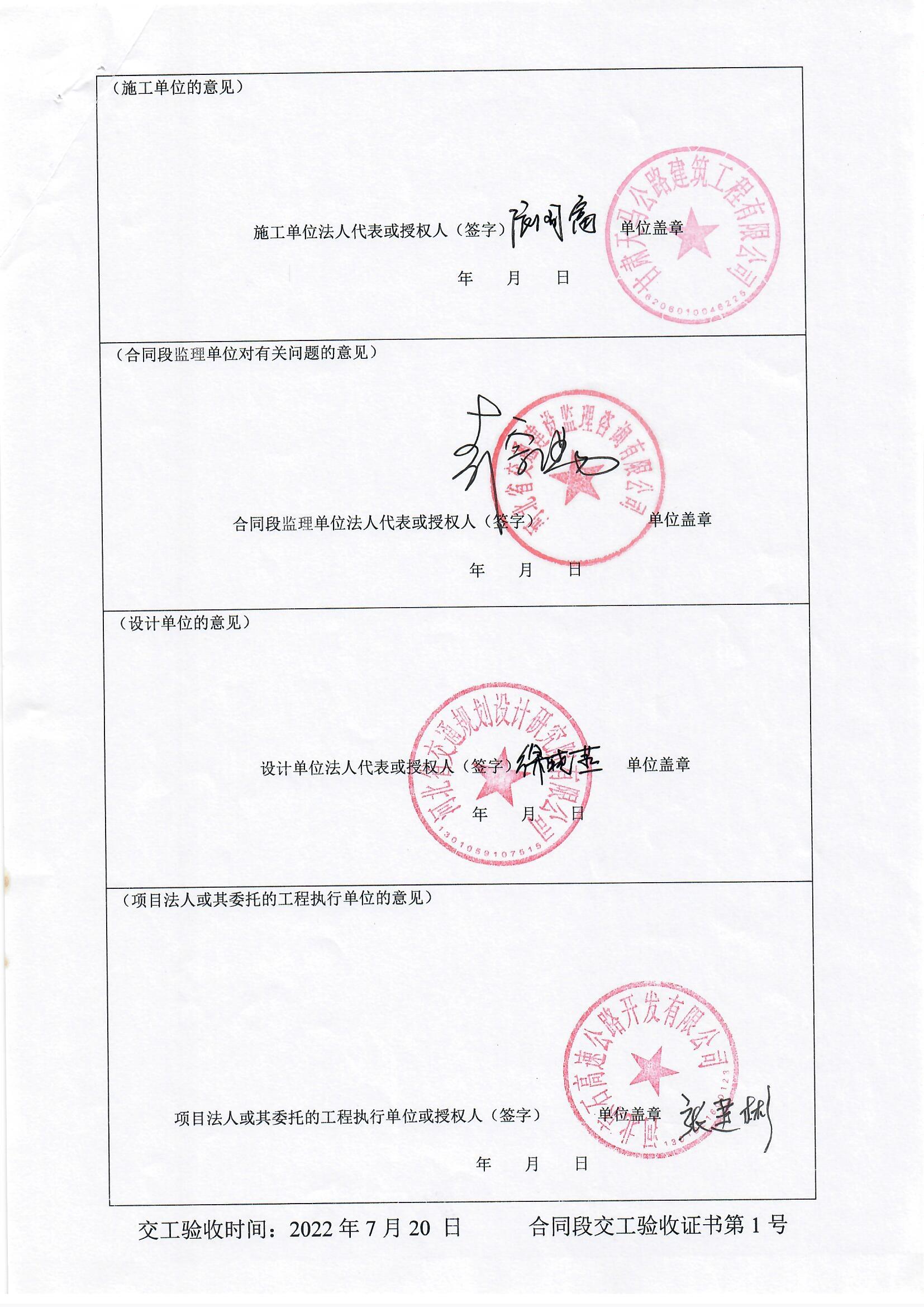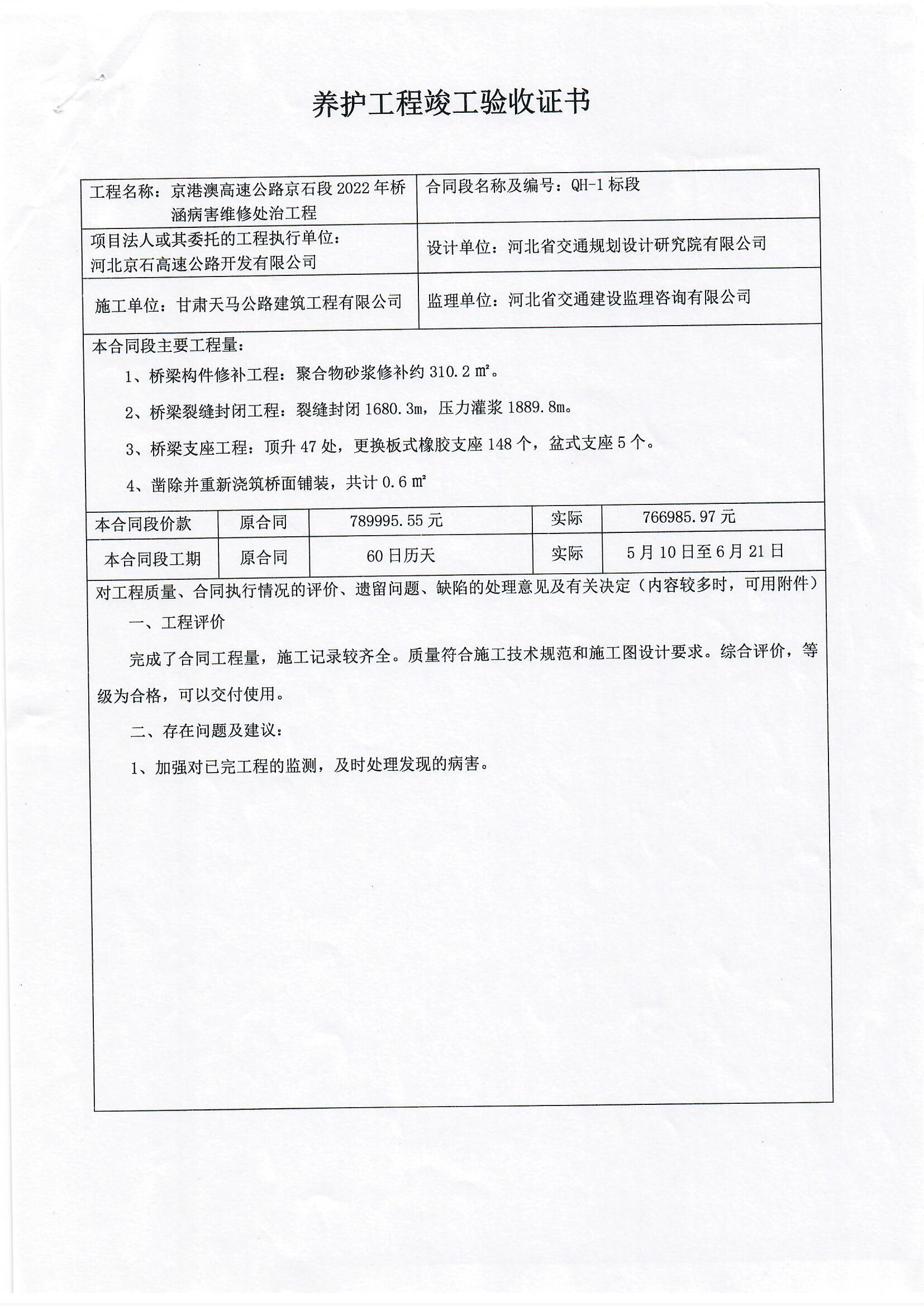 2022年橋涵病害維修處治工程QH-1標(biāo)段驗(yàn)收證書