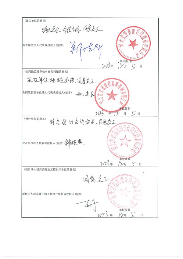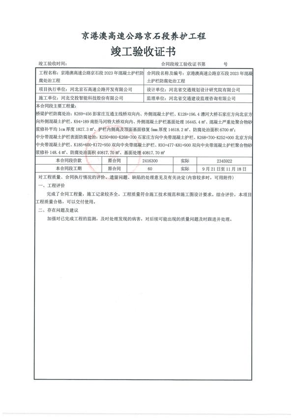 京港澳高速公路京石段2023年混凝土護(hù)欄防腐處治工程驗收證書
