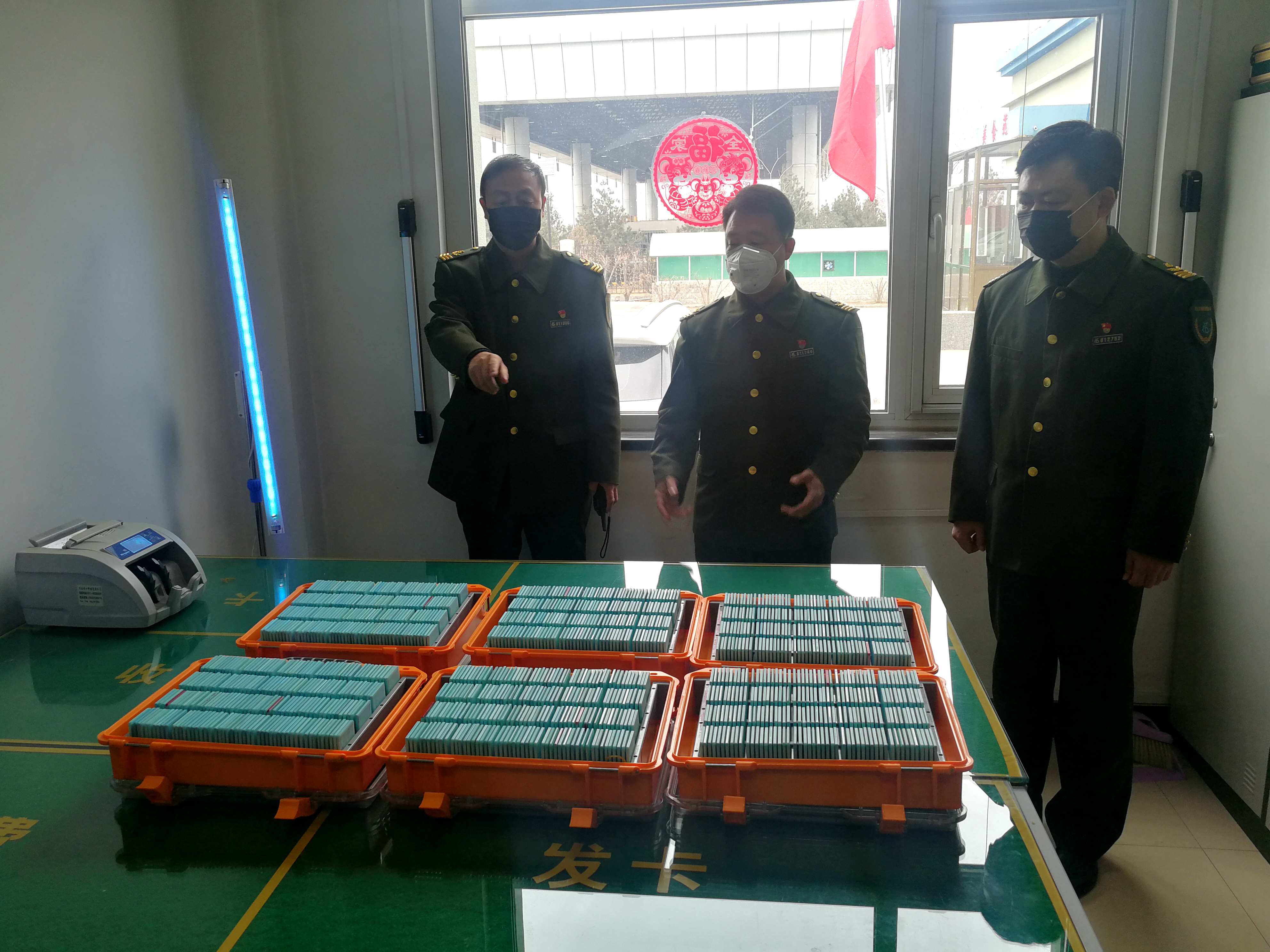 后勤保障工作全面到位。為打贏這場疫情防控阻擊戰(zhàn),緩解同志們工作上的壓力,減輕他們的勞動(dòng)強(qiáng)度,支部一班人還提出了“三個(gè)帶頭”:領(lǐng)導(dǎo)帶頭做好收費(fèi)崗位替崗工作,黨員帶頭分擔(dān)綠通檢驗(yàn)工作,退轉(zhuǎn)軍人帶頭分擔(dān)保障工作??紤]到一些老同志身體素質(zhì)等因素,從春節(jié)假期到現(xiàn)在仍采取四班三運(yùn)轉(zhuǎn)的倒班方式,每個(gè)班組上崗前,值班人員電話提醒身體不好的同志備足藥品,如發(fā)現(xiàn)特殊情況不能上崗的,備勤人員立即補(bǔ)位。針對各項(xiàng)防疫物資登記造冊,建立《防疫物資臺(tái)賬》、《防疫物資盤點(diǎn)表》、《防疫物資入庫登記表》、《防疫物資領(lǐng)用登記表》等,確保時(shí)時(shí)掌握物資使用情況。
