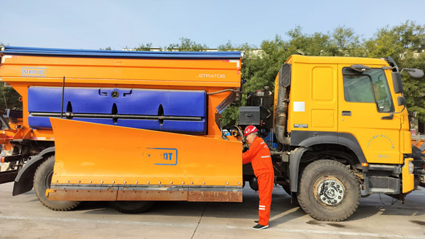 演練現(xiàn)場,除雪車、液體融雪劑撒布車、小型撒布機、巡查車等機械車輛整齊排列,蓄勢待發(fā);應急人員橘黃養(yǎng)護服,頭戴安全帽,精神抖擻,全部進入待命狀態(tài)。
