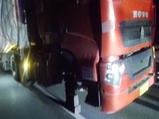 經(jīng)詢問司機(jī)得知,貨車右前輪突然掉落,導(dǎo)致車輛無法移動(dòng)。事發(fā)突然,且處于夜間,大風(fēng)呼嘯,情況十分危險(xiǎn)。定州工區(qū)工作人員立即反應(yīng),第一時(shí)間在貨車后方規(guī)范設(shè)置交通警示標(biāo)志,巡查車開啟導(dǎo)向標(biāo)、高音警報(bào)器,避免過往車輛發(fā)生碰撞事故,引導(dǎo)車上人員轉(zhuǎn)移至護(hù)欄外安全地帶。同時(shí),迅速撥打高速交警與救援電話,通報(bào)現(xiàn)場(chǎng)情況。智調(diào)中心及時(shí)利用可變情報(bào)板對(duì)后方來車予以提醒,避免造成事故。