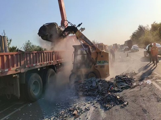 聞令而動(dòng),應(yīng)急響應(yīng)“快準(zhǔn)狠”。險(xiǎn)情即命令!工區(qū)立即啟動(dòng)應(yīng)急預(yù)案,養(yǎng)護(hù)人員快速集合,攜帶清障設(shè)備火速趕赴現(xiàn)場(chǎng)。抵達(dá)后發(fā)現(xiàn),路面堆滿水泥板碎塊,占據(jù)行車道,人工清理效率受限。工區(qū)當(dāng)即調(diào)整方案,增派鏟車、吊車等大型機(jī)械入場(chǎng)作業(yè),同時(shí)調(diào)配10名工作人員協(xié)同清理,同步安排專人在現(xiàn)場(chǎng)指揮交通,引導(dǎo)車輛有序通行,緩解擁堵。