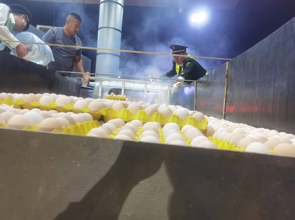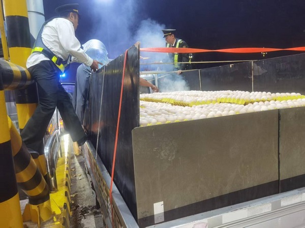 10月2日21時(shí)許,一輛車牌號(hào)為津GXXXX的貨車駛?cè)敫弑晔召M(fèi)站12車道。正在崗?fù)?nèi)執(zhí)勤的收費(fèi)人員敏銳發(fā)現(xiàn),該車車廂頂部裝載鮮雞蛋的紙質(zhì)蛋槽內(nèi)突然冒出濃煙,明火隨即竄出。收費(fèi)員立即通過對(duì)講機(jī)向值班站長劉偉緊急報(bào)告,并迅速示意司機(jī)將車輛??恐涟踩珔^(qū)域。