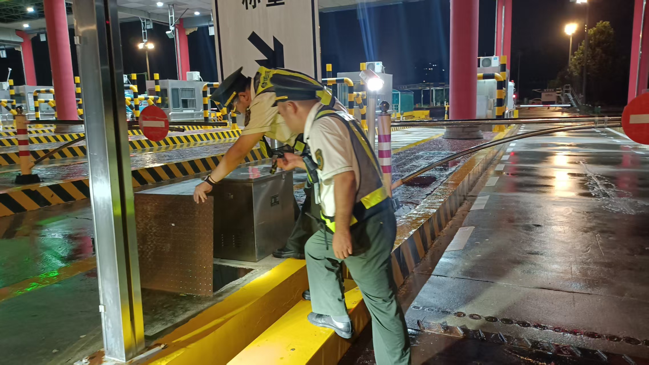 22時(shí)左右,雨勢(shì)開始逐漸減弱,于亮與疏導(dǎo)人員溫晨迅速走向雨幕,率先開展防汛應(yīng)急巡檢。他們逐一排查排水邊溝是否通暢、機(jī)電供電是否穩(wěn)定、計(jì)重設(shè)備是否正常運(yùn)行,不放過(guò)任何一處風(fēng)險(xiǎn)點(diǎn)。